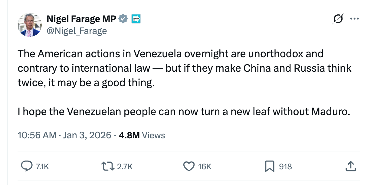 As a practical outcome, they are likely to be more more sympathetic to Trump’s actions in Venezuela. This may tell us something about potential foreign policy positioning under a hypothetical Farage-led government.