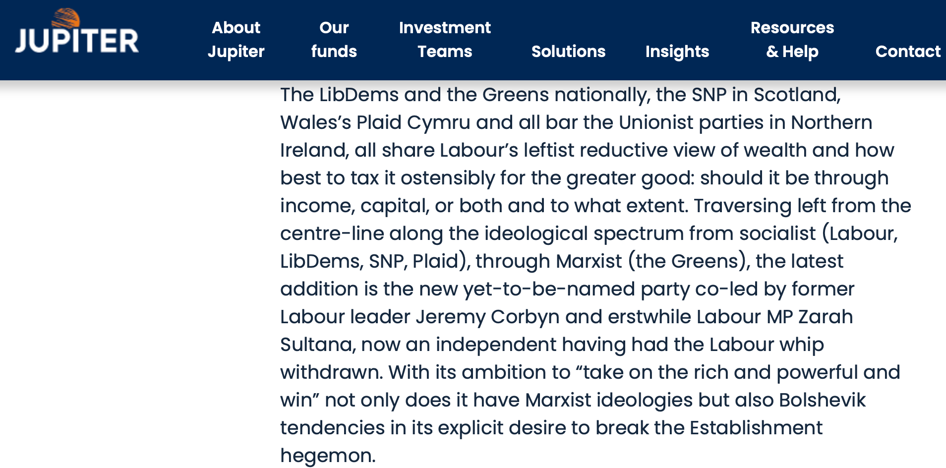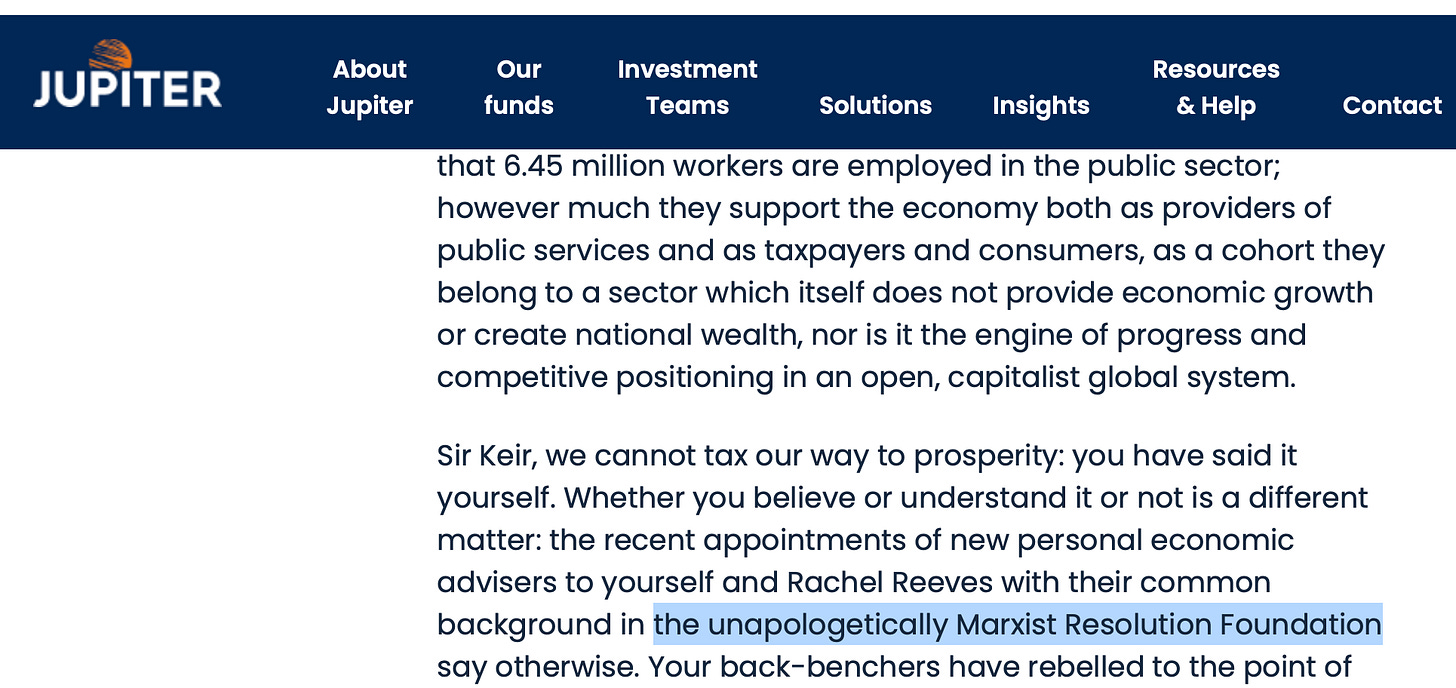 So it is refreshing to read some unrestrained bonkers stuff in the Merlin Weekly Macro newsletter. I don’t know the Merlin people at all, but they now sit under Jupiter from what I can see. The Merlin Weekly Macro newsletter has frequently delved into politics - a few snips below. Calling the Resolution Foundation “unapologetically Marxist” is a particular fave.